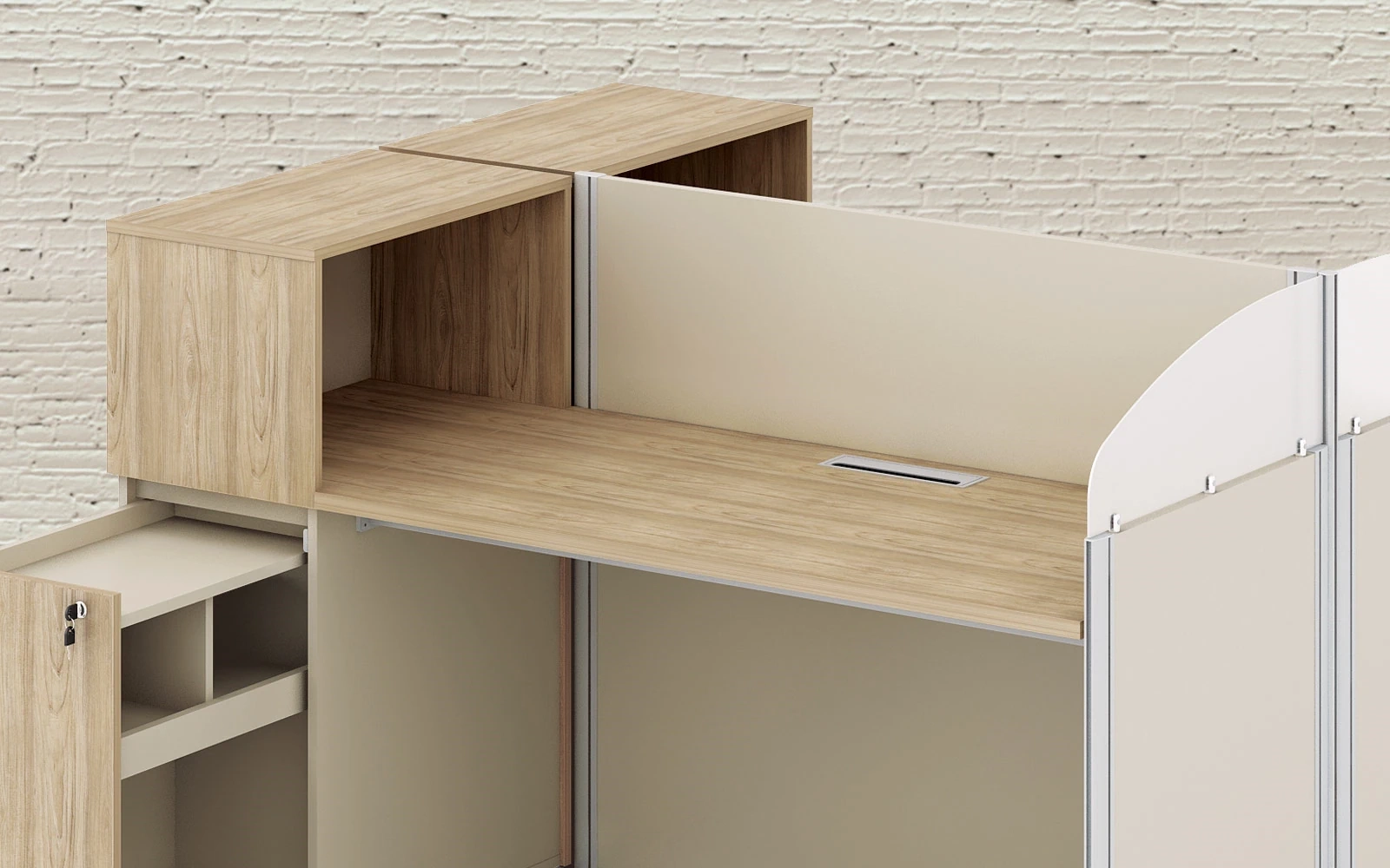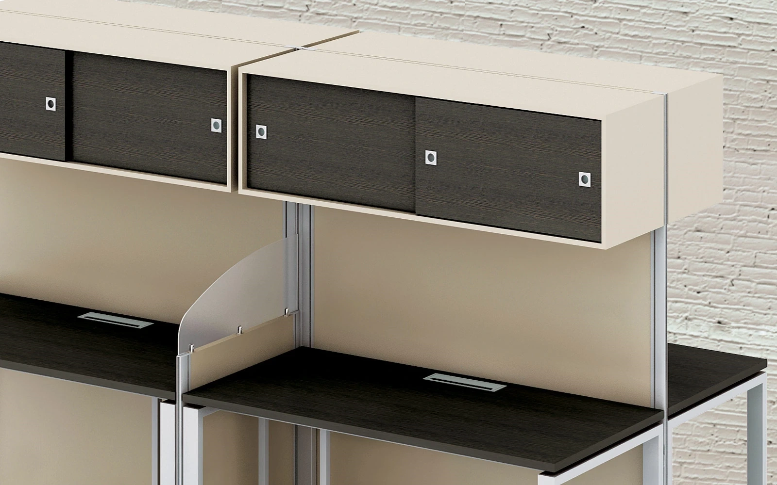 «Rio | System» позволяет гибко комбинировать модули, чтобы организовать в офисе максимальное количество рабочих мест и комфортно разместить большое количество сотрудников на небольшой площади. Компактное рабочее место отличается высокой функциональностью: всё необходимое под рукой. Навесные полки вмещают большое количество папок. Тумбы и стеллажи разной конфигурации улучшают эргономику рабочего места, обеспечивая быстрый доступ к документам и канцелярским принадлежностям.